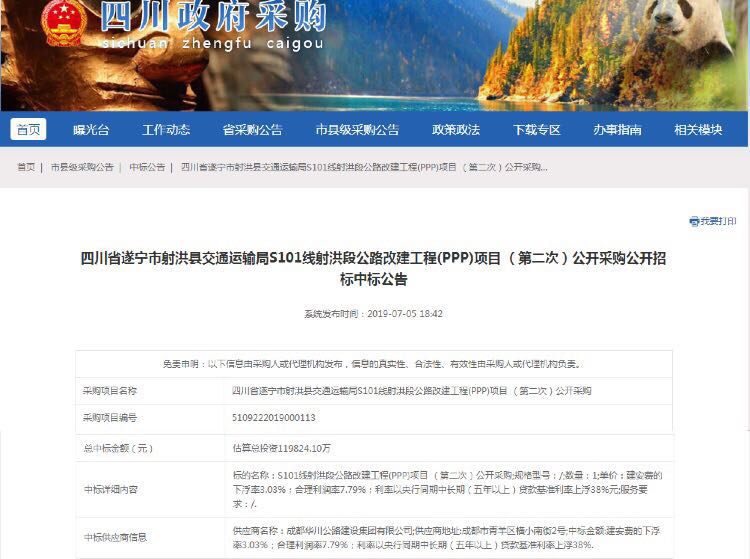 近日,集團成功中標(biāo)四川省S101線射洪段公路改建工程(PPP)項目。7月5日,四川政府采購網(wǎng)正式發(fā)布中標(biāo)公告。