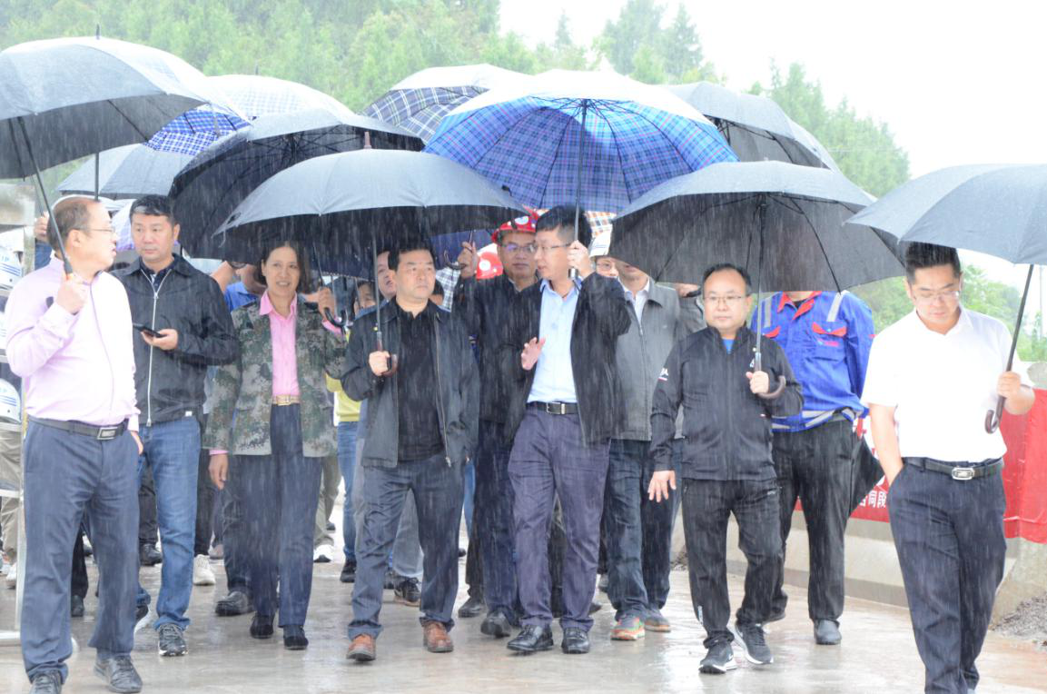 9月17日,集團(tuán)黨委書(shū)記、董事長(zhǎng)、總裁謝應(yīng)文、常務(wù)副總裁駱曉紅等領(lǐng)導(dǎo)率集團(tuán)各職能部門(mén)負(fù)責(zé)人,在營(yíng)達(dá)項(xiàng)目向年底通車(chē)目標(biāo)發(fā)起總攻、決戰(zhàn)決勝的關(guān)鍵時(shí)刻,冒雨深入營(yíng)達(dá)高速項(xiàng)目施工一線(xiàn)現(xiàn)場(chǎng)督導(dǎo)慰問(wèn)。營(yíng)達(dá)公司總經(jīng)理謝應(yīng)武及參建單位負(fù)責(zé)人等陪同。
