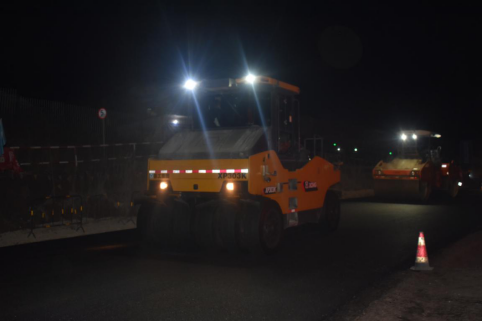 在各施工現(xiàn)場(chǎng),不懼嚴(yán)寒、熱火朝天。攤鋪機(jī)、壓路機(jī)、運(yùn)料車等各類施工機(jī)械一派繁忙,全體人員履職盡責(zé)、分工協(xié)作,各項(xiàng)施工作業(yè)有序進(jìn)行著。項(xiàng)目領(lǐng)導(dǎo)班子工作重心前移生產(chǎn)一線,實(shí)行現(xiàn)場(chǎng)辦公,第一時(shí)間解決施工重難點(diǎn),日夜巡查督導(dǎo)質(zhì)量安全、施工進(jìn)度、材料保供等工作內(nèi)容,確保項(xiàng)目生產(chǎn)高效推進(jìn);工程人員加強(qiáng)前后場(chǎng)的相互配合、按需供料,保證施工不間斷;5+2、“白+黑”、雨加晴,24小時(shí)堅(jiān)守崗位、奮戰(zhàn)一線,嚴(yán)格按照施工技術(shù)及標(biāo)準(zhǔn)規(guī)范高標(biāo)準(zhǔn)、嚴(yán)要求開(kāi)展每天的施工任務(wù);時(shí)刻緊盯每一個(gè)施工環(huán)節(jié),嚴(yán)格控制施工質(zhì)量,一一落實(shí)混合料配合比、溫度、厚度、寬度、攤鋪、碾壓等質(zhì)量控制要點(diǎn),確保攤鋪、碾壓等工序的有序銜接;同時(shí)強(qiáng)化安全規(guī)范操作,嚴(yán)防各類安全事故發(fā)生。