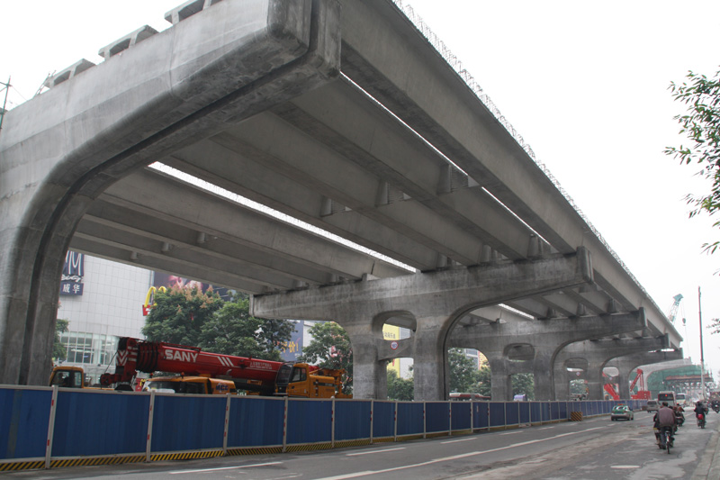 二環(huán)路東段改造工程路面施工,施工時(shí)間為2012年5月到2013年7月,投資為4.97億元,該工程北起二環(huán)路北府河橋東側(cè),向東經(jīng)商貿(mào)大道、火車北站、雙橋子立交,南止于二環(huán)路南府河橋東側(cè),全長(zhǎng)13.1公里。為“連續(xù)高架快速路+地面城市主干路”,底層道路按照雙向6-8車道建設(shè),高架快速車道為雙向6車道,路面面積80.43萬(wàn)m³。主要工程內(nèi)容包括:瀝青砼路面鋪裝(含噴砂打毛和防水層)、底層道路路面施工(含底基層、基層、面層、路緣石等附屬工程)
